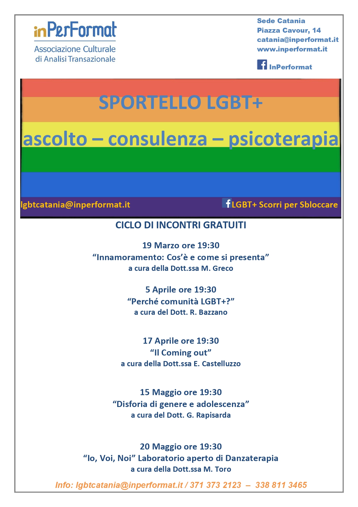Per informazioni o prenotazioni è possibile mandare un'email a lgbtcatania@inperformat.it o chiamare il 371 3732123 o 338 8113465